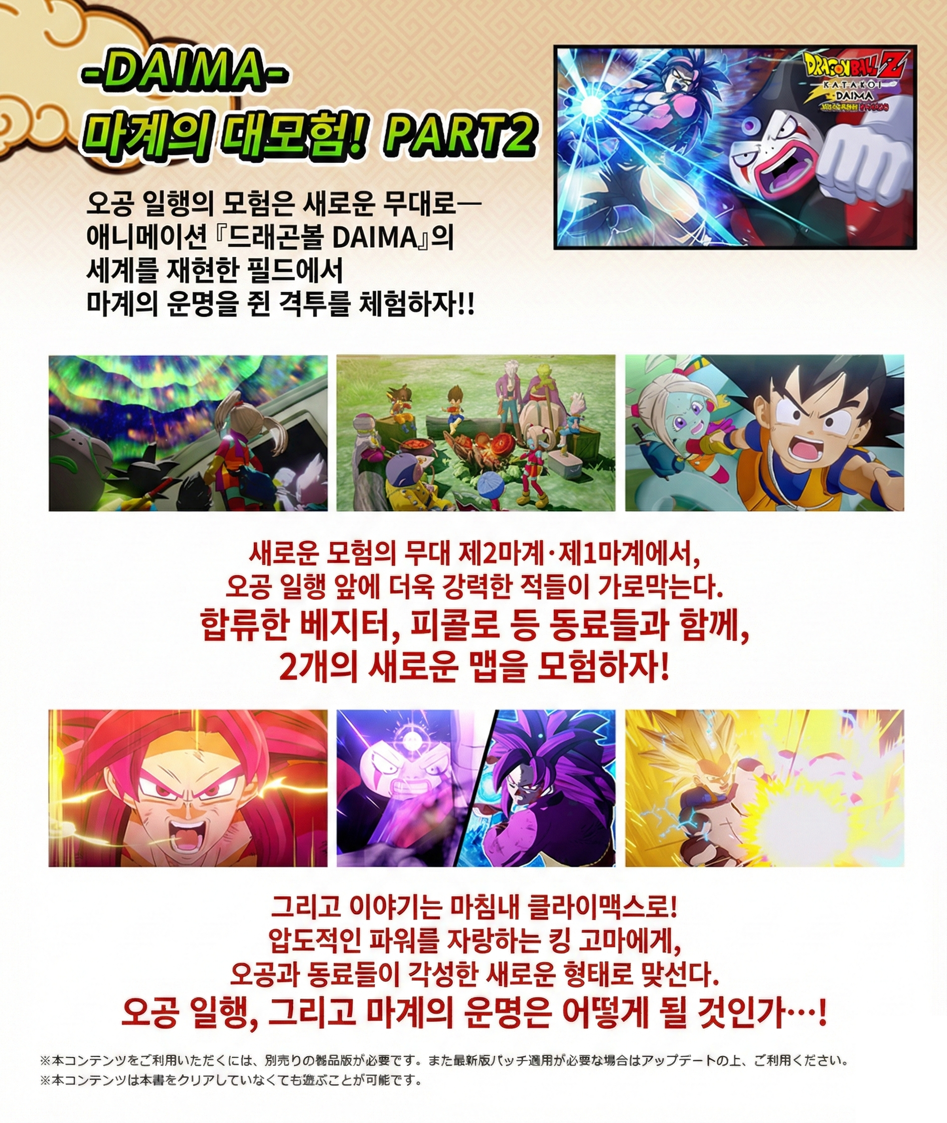 이번 DLC는 현재 인기리에 방영 중인 애니메이션 드래곤볼 다이마의 세계관을 그대로 옮겨왔어요. 파트 1에서 대마계로 떠났던 오공 일행의 뒤를 이어, 이번 파트 2에서는 드디어 **베지터(미니)**를 직접 플레이할 수 있게 됐답니다!