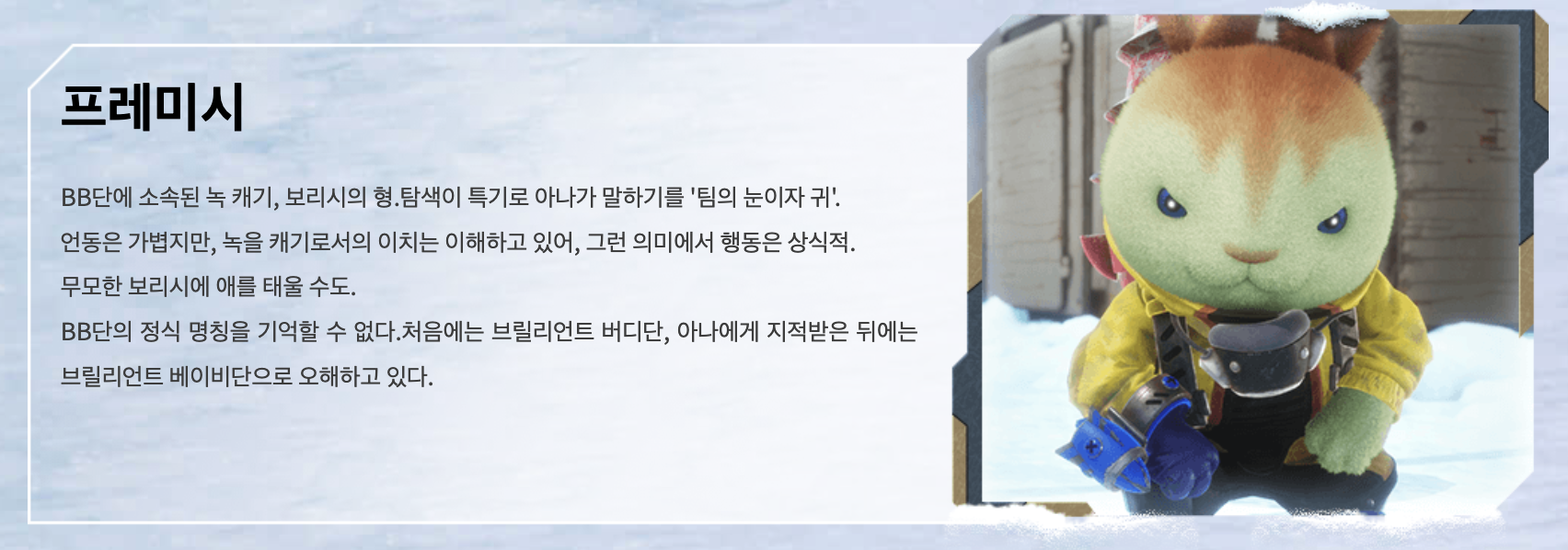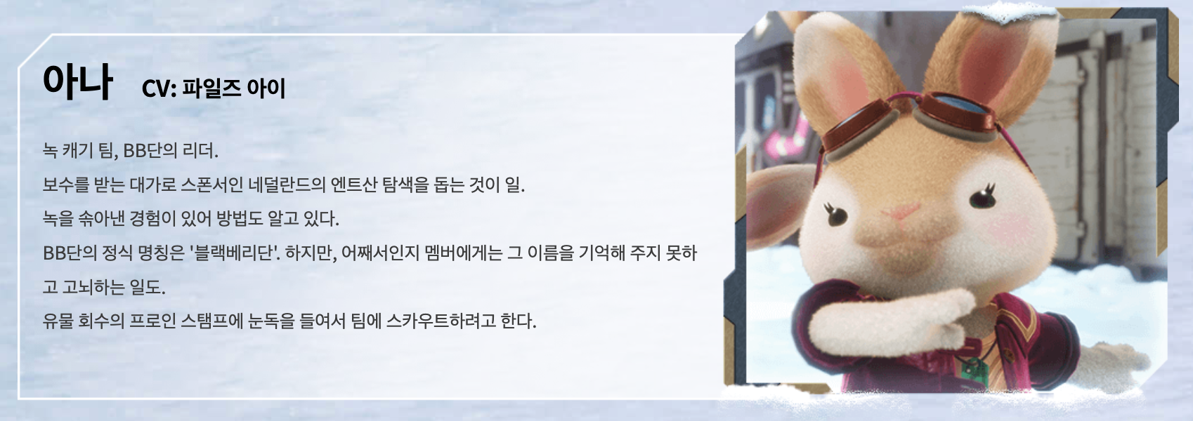 아나 BB단 리더. 똑부러진 성격. 단 이름이 잘 기억 안 남 😅 파이루즈 아이