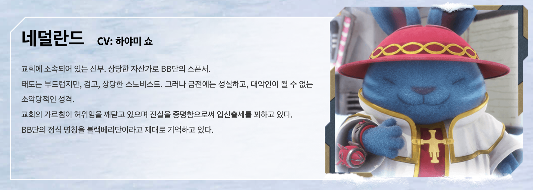네더랜드 자금줄 + 고용주. 단 이름 정확히 기억하는 유일한 토끼 하야미 쇼