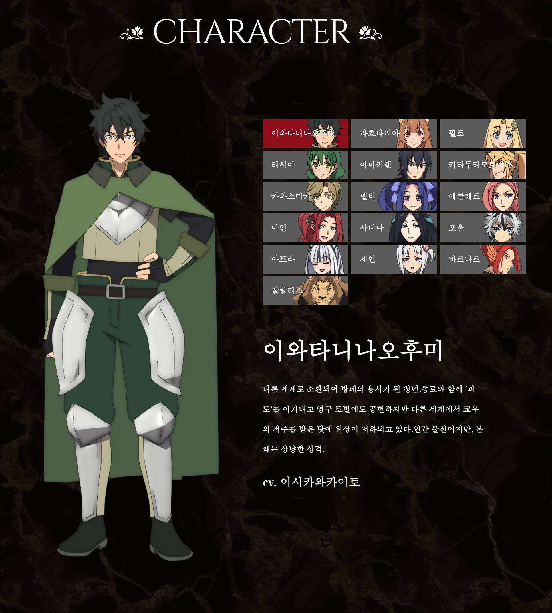 - 이와타니 나오후미: 원래는 평범한 대학생이었지만, 방패 용사로 소환되어 수많은 고난을 극복한 성장형 주인공.