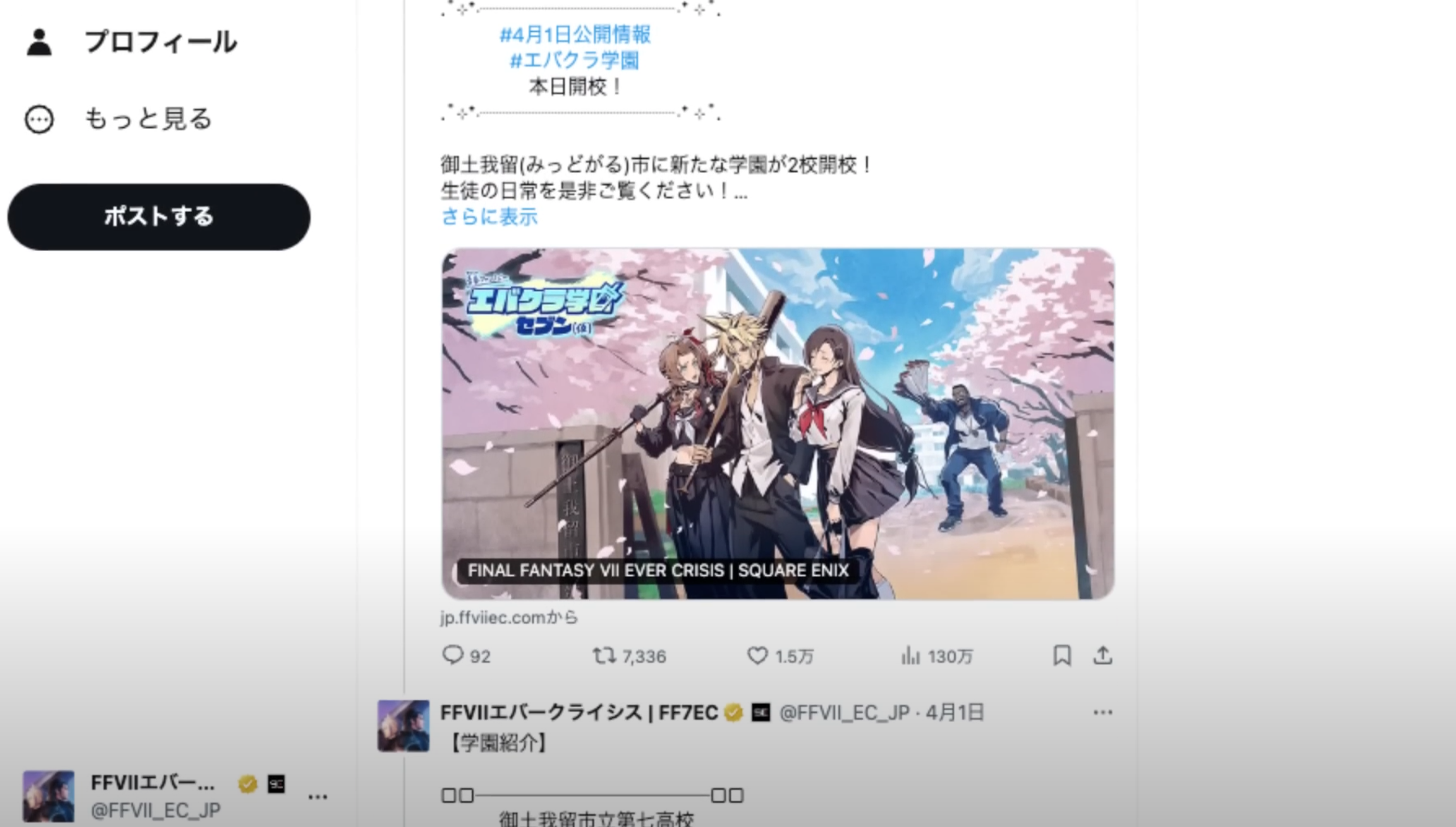 처음에는 믿기 힘들었지만, 『FF7 에버 크라이시스(FF7EC)』의 공식 X(구 트위터)에 올라온 한 장의 이미지가 모든 것을 바꿔놓았습니다. “다음 이벤트는 학원물입니다!“라는 문구와 함께 공개된 캐릭터들의 교복 이미지. 세피로스가 검도부, 에어리스는 여고생 야쿠자, 티파는 엄격한 반장, 클라우드는 불량소년!?