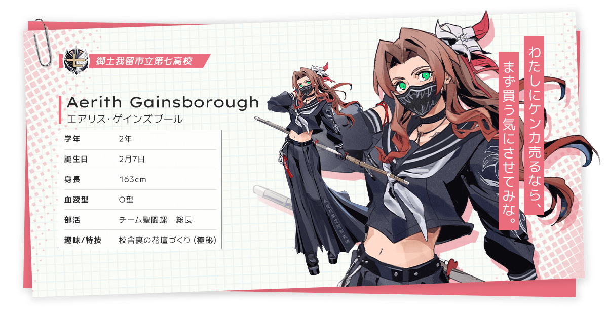 가장 눈길을 끄는 캐릭터는 단연 에어리스. 평소엔 따뜻하고 온화한 이미지로 그려졌던 그녀가 이번에는 불량 학생 팀 ‘성전나(セトラ)’의 총장으로 등장합니다. 말투도 거칠고, 어깨에는 백합 문양의 학란(학원 롱코트), 머리는 고전적인 포니테일. 그야말로 완벽한 ‘스케반 캐릭터’.