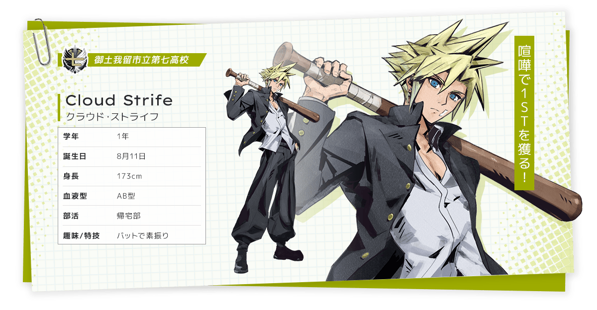 그리고 클라우드는 불량소년에 대한 동경이 강한 ‘미숙한 외톨이’. 뱃지를 반쯤 달고 교문에 기대 선 모습은, 원작에서 ‘소저 1ST’를 동경하던 설정을 연상케 합니다. 이번에는 ‘소저’가 아닌 ‘켄카 1ST’를 꿈꾸죠. 아련하면서도 귀여운 모습.