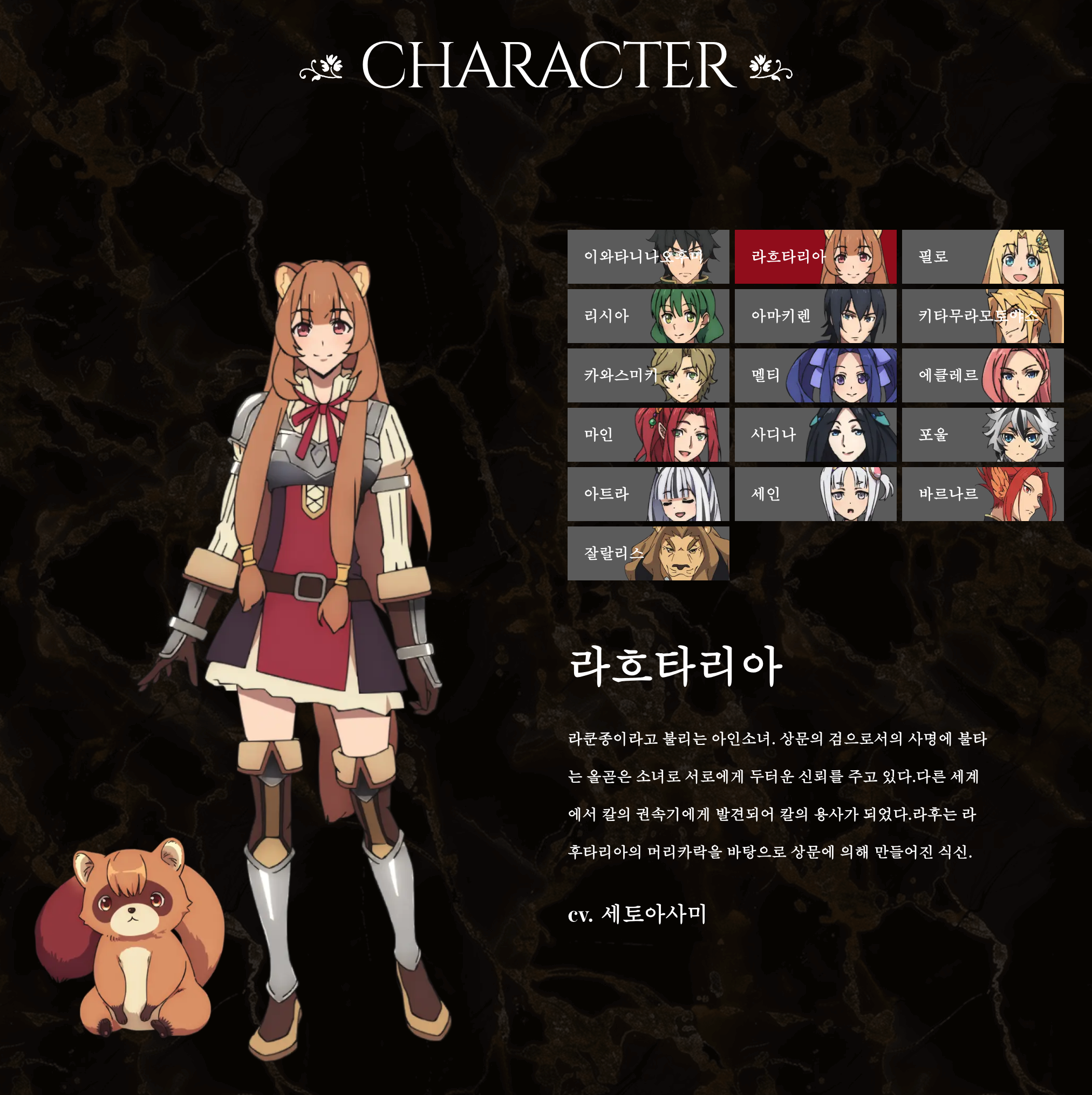 - 라프타리아: 원래는 노예였지만 나오후미의 조력자가 되어 방패 용사의 검 역할을 맡는 동료.