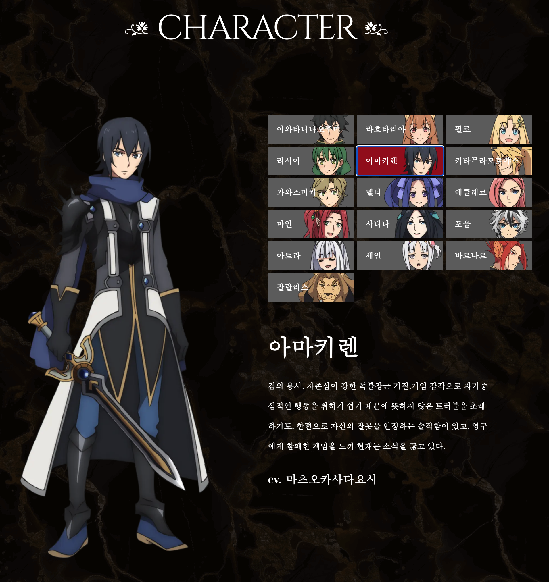 - 이와타니 나오후미: 원래는 평범한 대학생이었지만, 방패 용사로 소환되어 수많은 고난을 극복한 성장형 주인공.